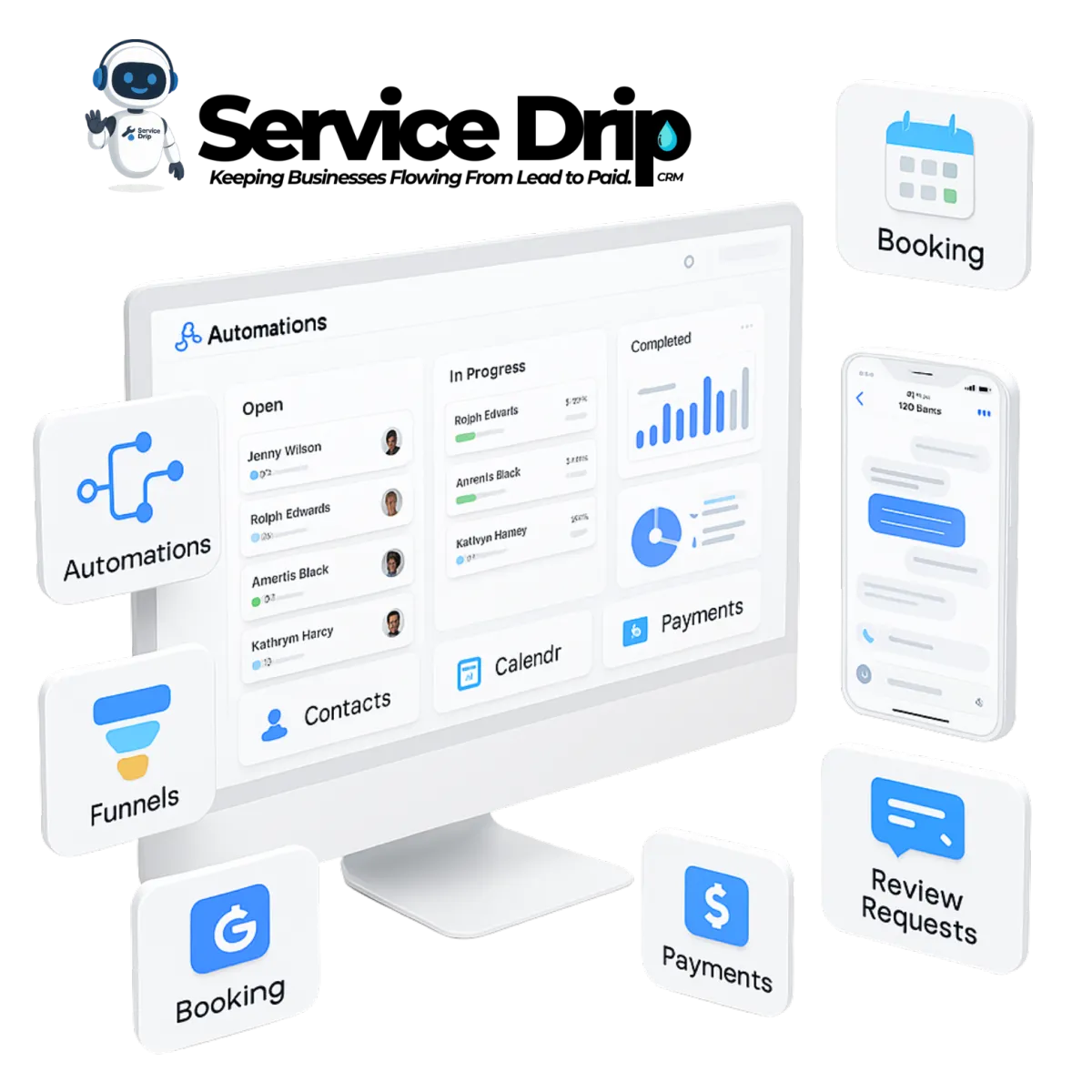 Service Drip is an all-in-one CRM and automation platform built specifically for service-based businesses. It replaces multiple tools (CRM, booking system, review software, text/email marketing, funnels, and more) and centralizes everything in one simple dashboard.